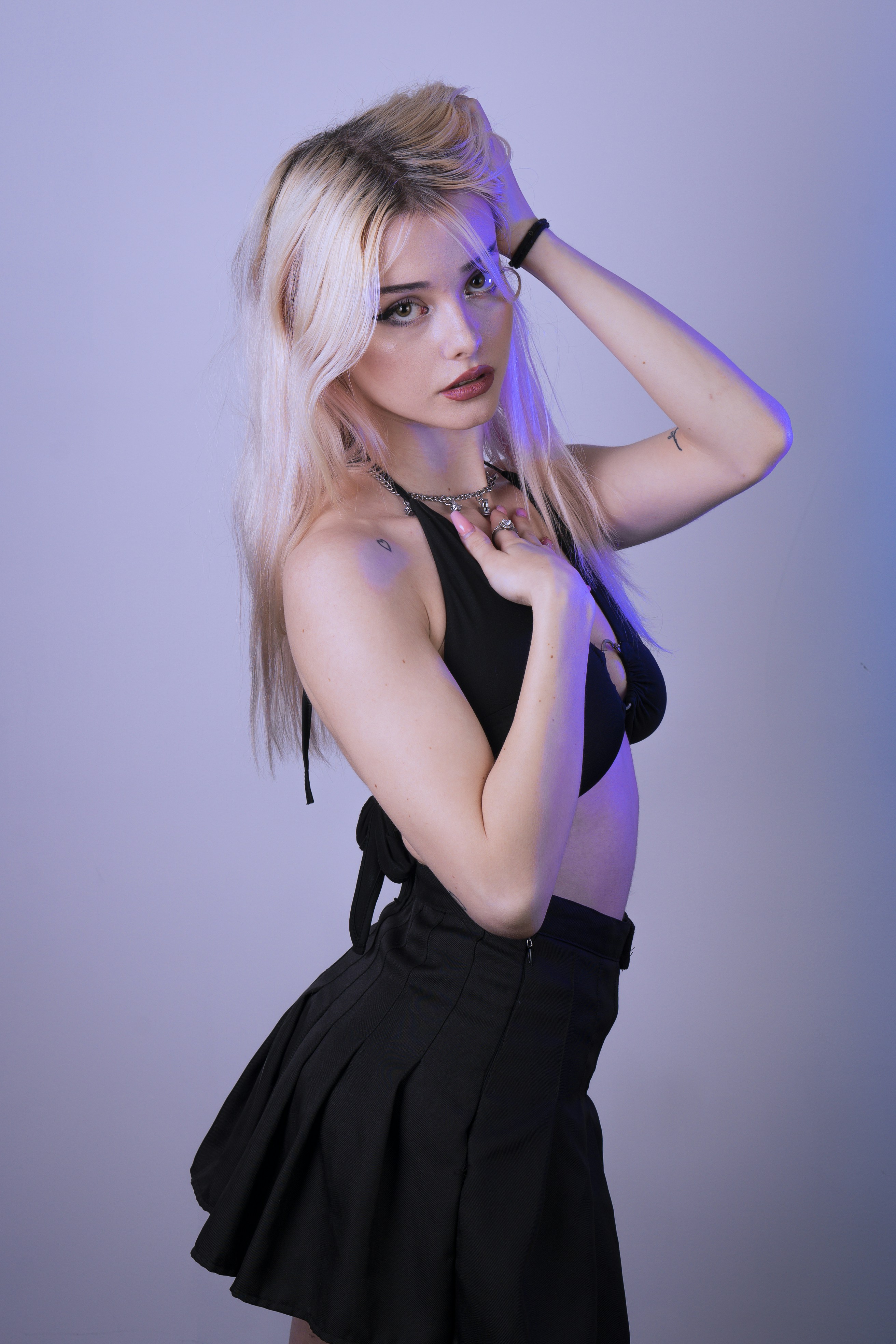 The sun had dipped below the horizon, casting the modern apartment in a warm, golden glow. The gentle hum of city life floated through the open balcony doors, mingling with the anticipation that hung heavy in the air. Luna, a 21-year-old with fiery auburn hair and captivating green eyes, stood in the center of the room. Her lithe figure was accentuated by a delicate, lacy black lingerie set that screamed both innocence and provocation.